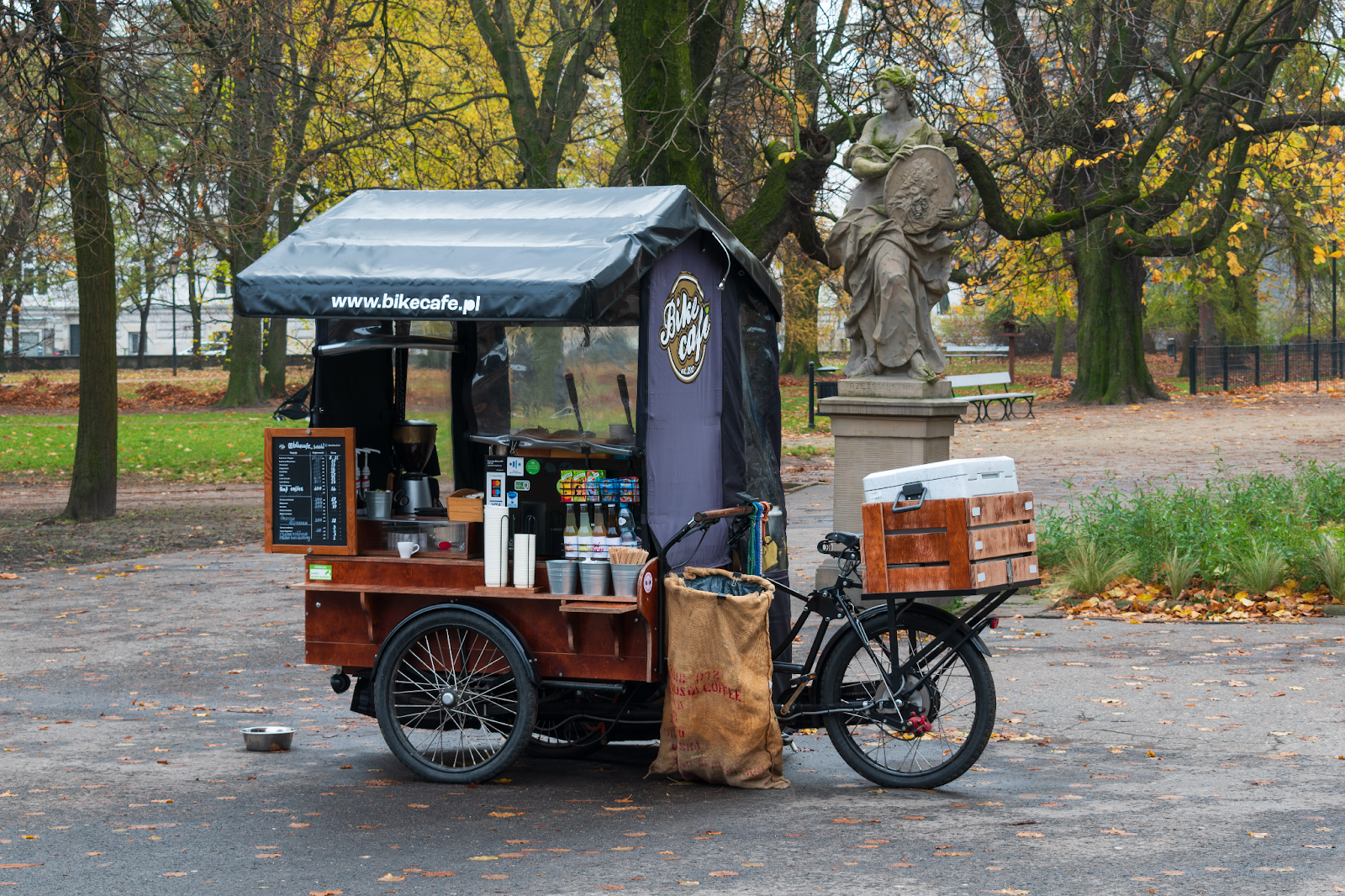 A more traditional mobile ‘bicycle’ coffee cart ready for some trade in a local park.